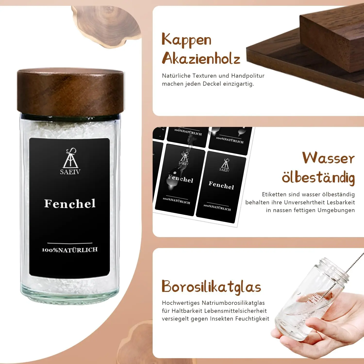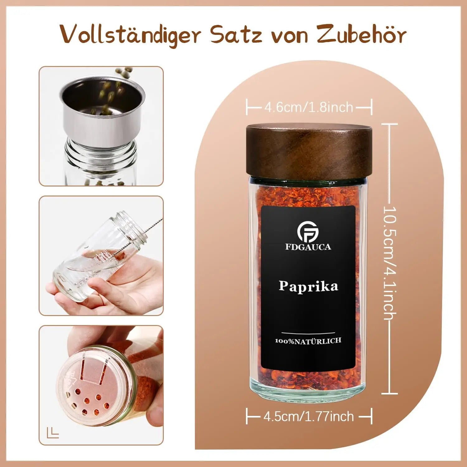 Set of 12/24 round bottles with rosewood lids, spice labels, kitchen spice storage expert, 100 ml glass spice jars